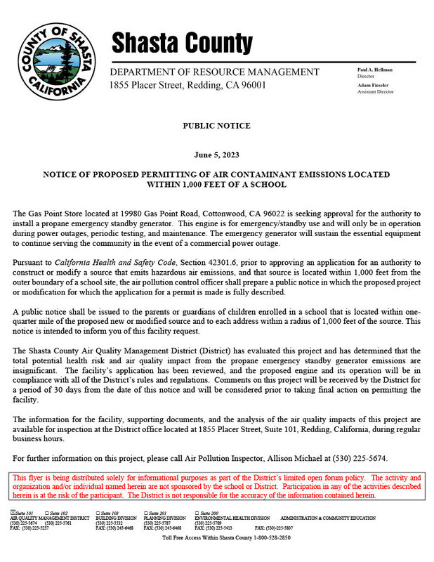 Please see the following public notice from the Shasta County Department of Resource Management.