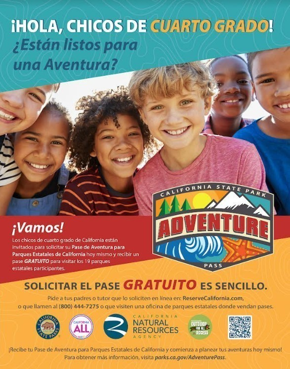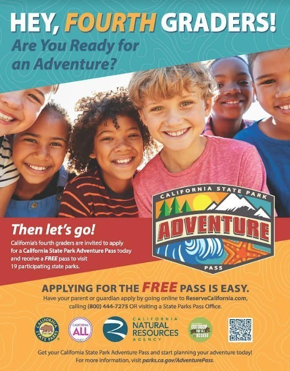 California State Parks wants every 4th grader and their families to know about the Adventure Pass! The Adventure Pass will get every 4th grader and their family free admission to 19 participating California State Parks for one year (Sept-Aug). See below for info!