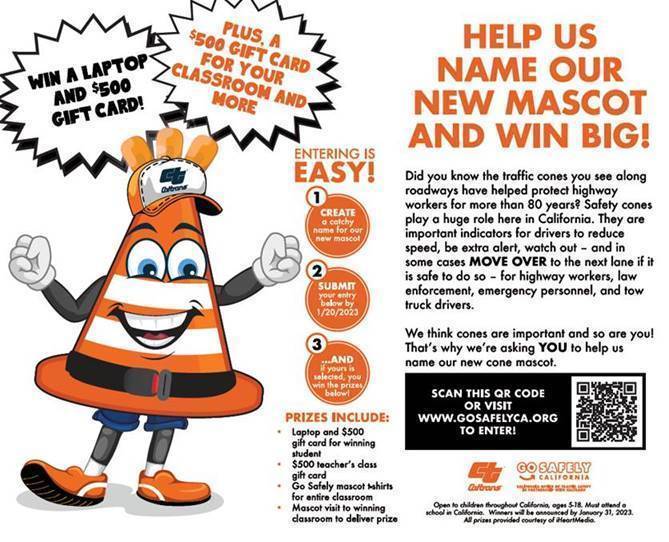 Go Safely California is on the search for a name for its new cone mascot. If you have a creative name idea, now is your chance to win a laptop, a $500 gift card, plus a $500 class gift card and prizes for your classroom!